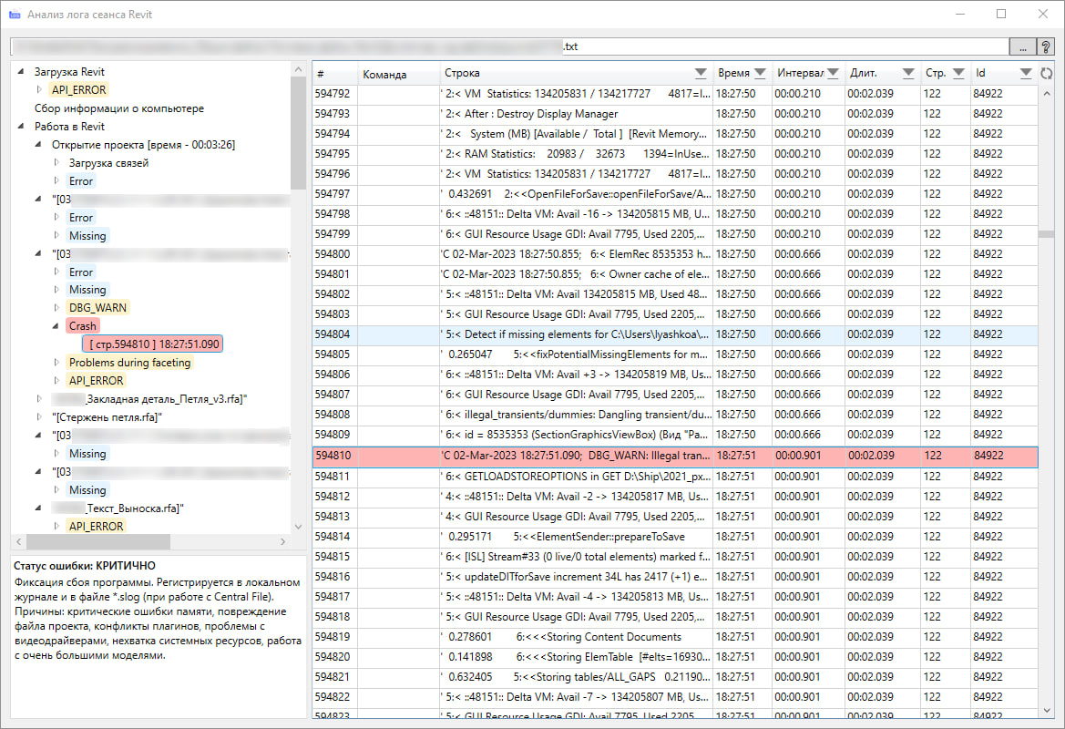 Слева — список этапов: загрузка Revit, открытие проектов, команды и т.д. - Цветовая подсветка ошибок